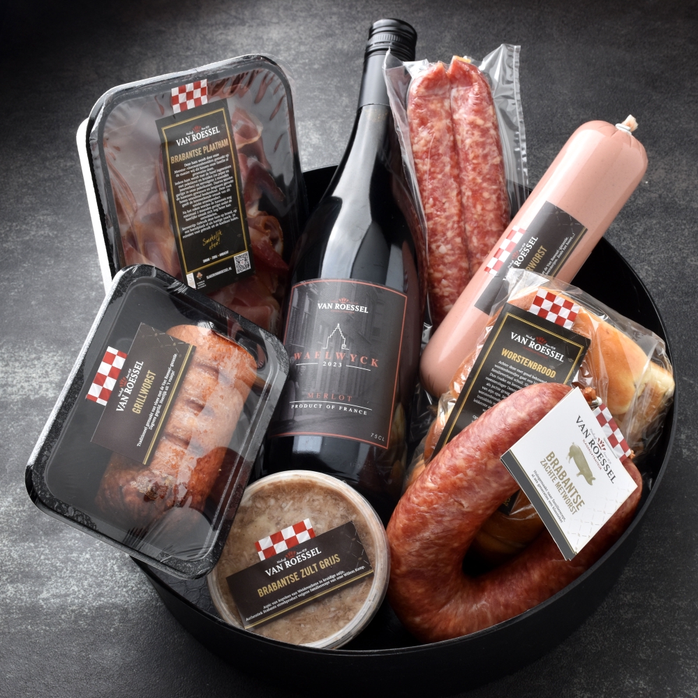 Een pakket van een aantal bekroonde streekspecialiteiten, zoals Brabantse plaatham, zachte Brabantse metworst, dijkworst, Grilworst, Brabantse zult en mini-worstenbroodjes. Aangevuld met een fles Merlot van onze Waelwijck-huisselectie.