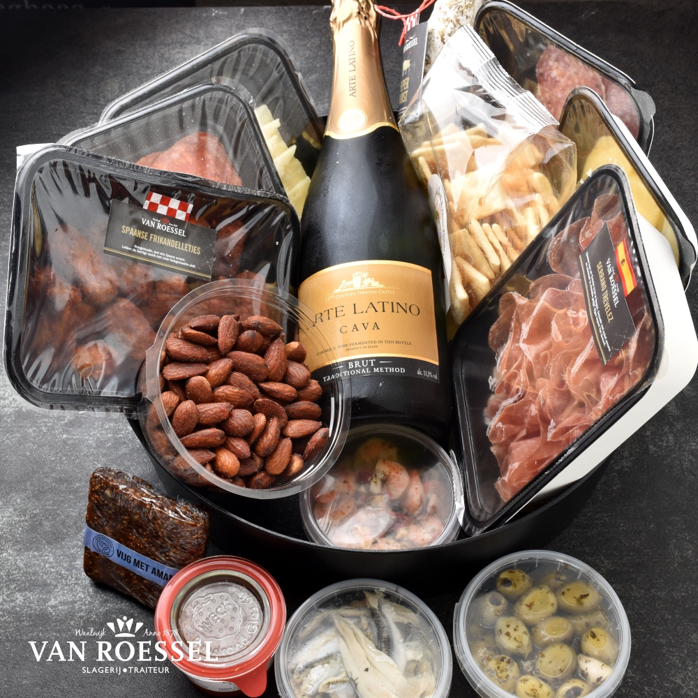Een pakket vol hapjes met een Spaanse twist, zoals Manchegokaas, huisgemaakte aioli, Serranoham, Saltufo, huisgemaakte droge worst, Chorizo troncal, Spaanse frikandelletjes, Gamba’s in knoflookolie, Ansjovis en knoflookolijven. Aangevuld met dippers, rookamandelen, kweepeer gelei en een fruitcarre. Dit alles onder begeleiding van een prachtige fles Cava.