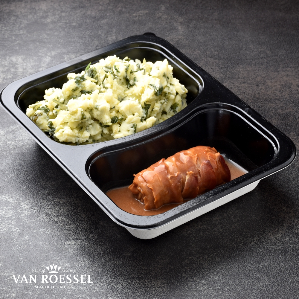 Opwarmadvies bij voorkeur in de oven (zwarte bak): 20 – 25 minuten in een voorverwarmde oven van 175C of 4 – 5 min. in de magnetron op vol vermogen (gaatjes in folie). Ook geschikt om in te vriezen.