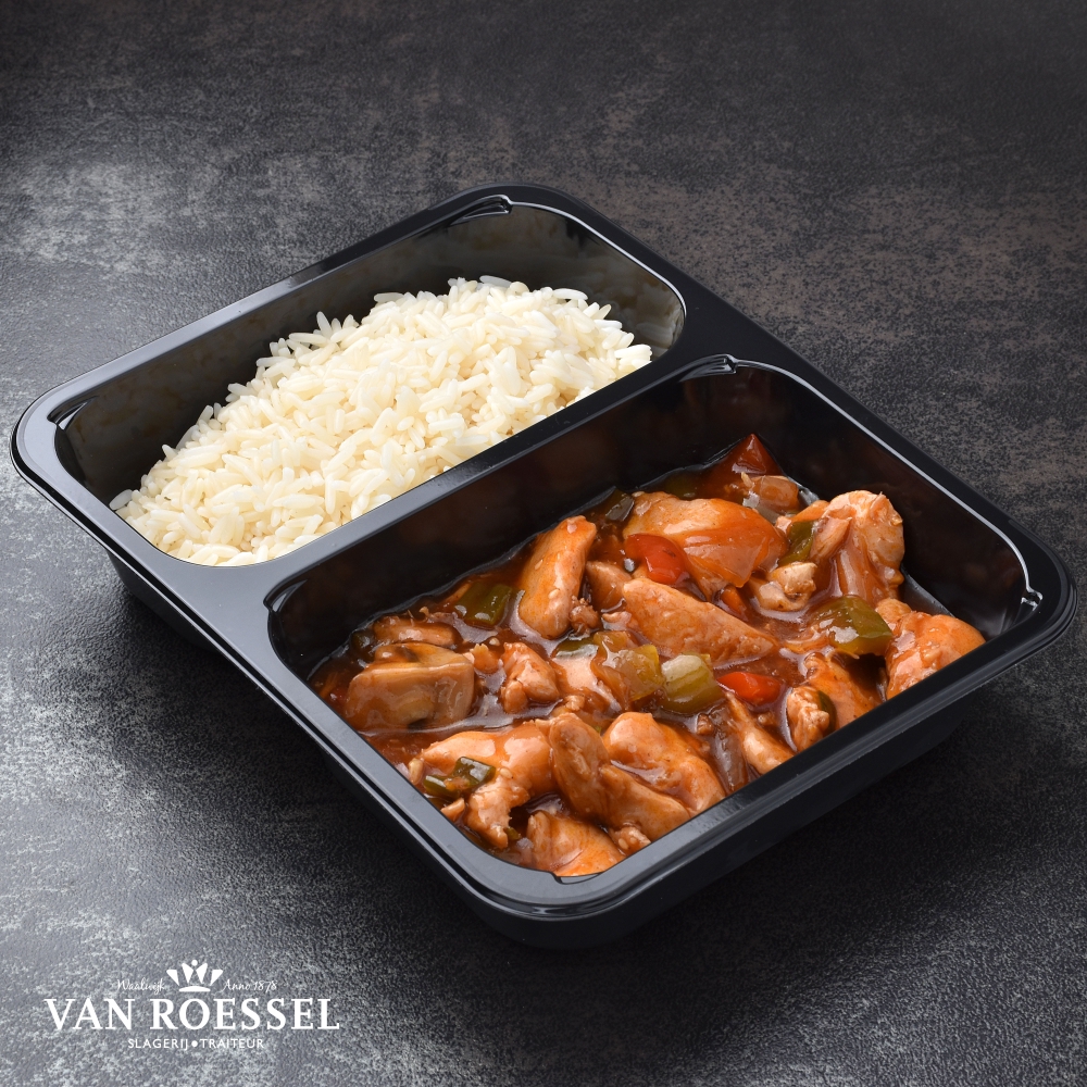 Malse kipfilet van onze vertrouwde kip met gebakken groenten in een oosterse saus met sesam. Gecombineerd met witte rijst.