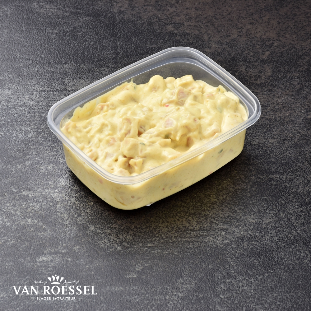 Huisgemaakte salade van malse blokjes scharrelkipfilet in een kruidige mayonaise met kerrie. Classic!